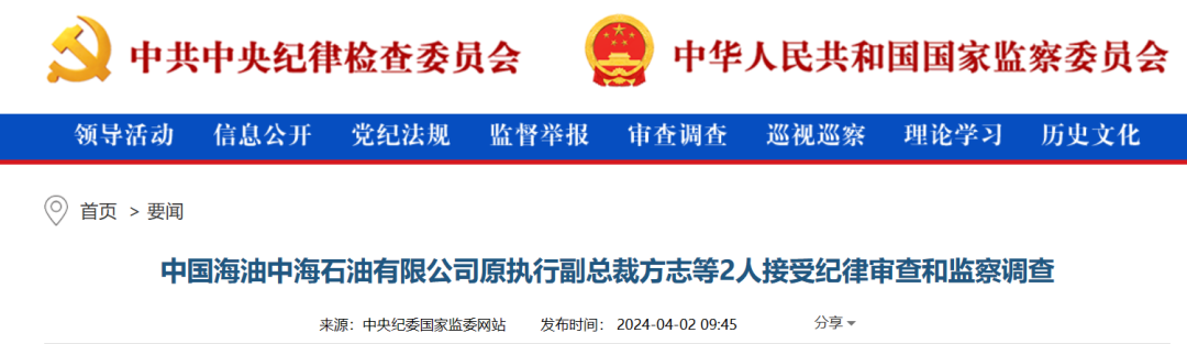 中央紀委國家監(jiān)委網(wǎng)站4月2日消息,據(jù)中國海油紀檢監(jiān)察組、江蘇省紀委監(jiān)委消息:中國海油中海石油有限公司原執(zhí)行副總裁方志、中國海油中海石油(中國)有限公司天津分公司渤海地區(qū)協(xié)調(diào)工作領(lǐng)導小組原專職副組長陳明涉嫌嚴重違紀違法,目前正接受中國海油紀檢監(jiān)察組和江蘇省監(jiān)委紀律審查和監(jiān)察調(diào)查。