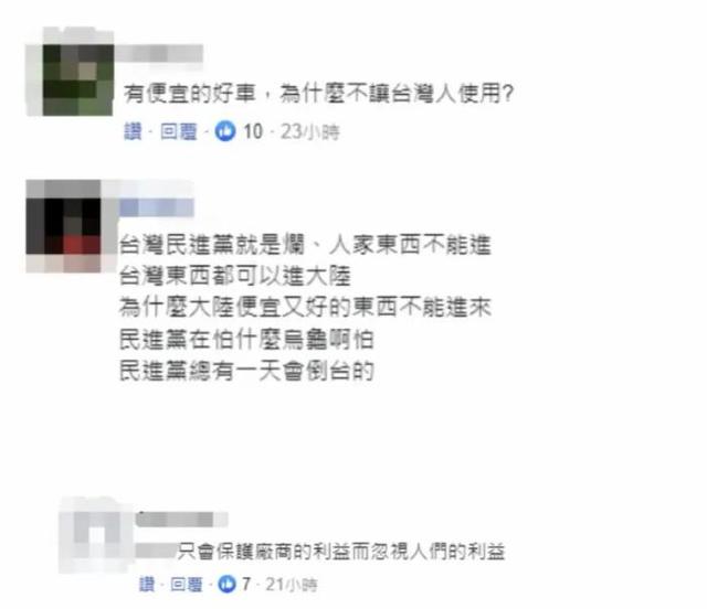 根據(jù)臺灣地區(qū)現(xiàn)行政策,大陸汽車整車、底盤及部分零組件仍被列為“禁入項(xiàng)”。而島內(nèi)民眾對民進(jìn)黨當(dāng)局的做法并不買賬,相關(guān)報道也引發(fā)網(wǎng)民“吐槽”——“有便宜的好車,為什么不讓臺灣人使用”“民進(jìn)黨能讓它進(jìn)來嗎?那豈不是影響了歐美進(jìn)口車的行情”。更有不少批評聲音指出,島內(nèi)汽車市場在貿(mào)易保護(hù)主義作用下簡直是“一潭死水”,創(chuàng)新能力越來越弱。