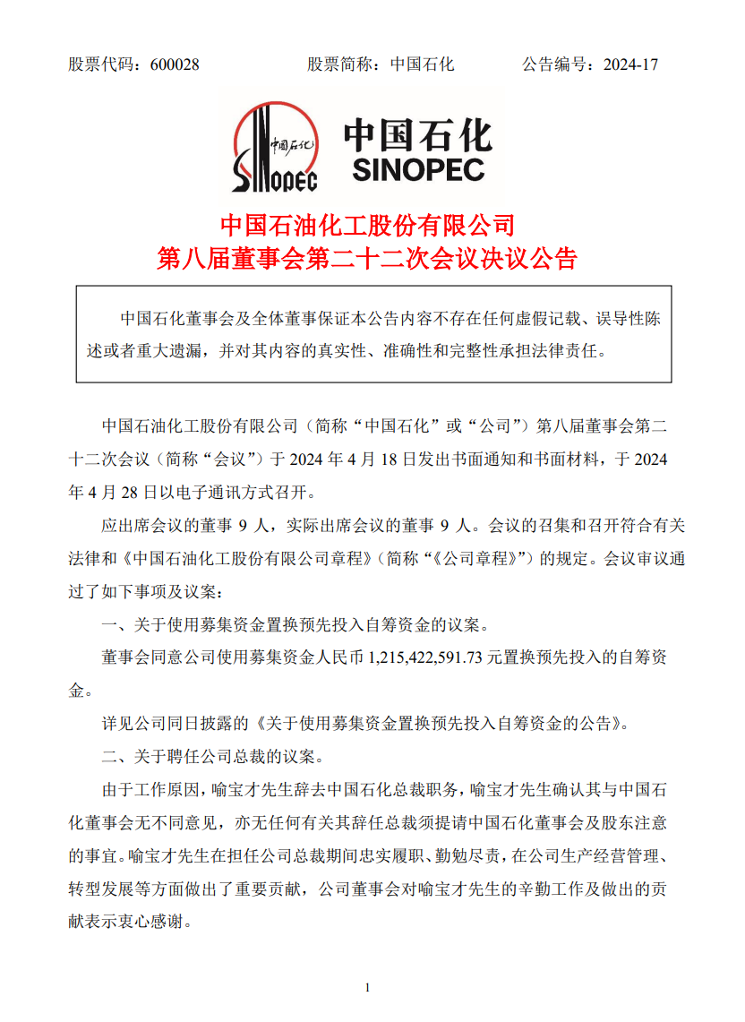 4月29日,中國石化發(fā)布公告稱,由于工作原因,喻寶才先生辭去中國石化總裁職務(wù)。董事會(huì)聘任趙東先生為中國石化總裁,同時(shí)調(diào)整為執(zhí)行董事,聘期自董事會(huì)批準(zhǔn)之日起至第八屆董事會(huì)任期屆滿時(shí)止。