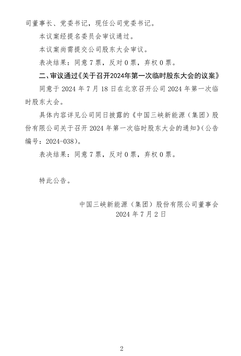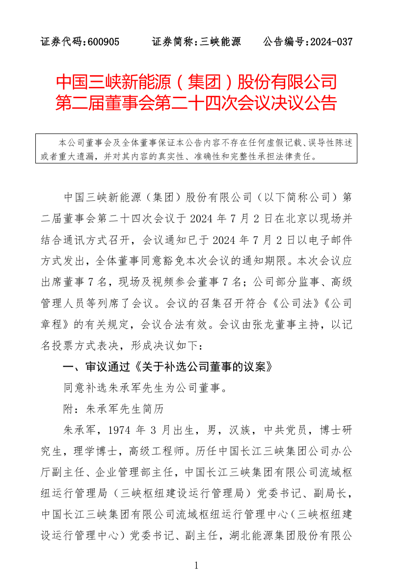 7月2日,三峽能源發(fā)布公告稱,公司第二屆董事會第二十四次會議于7月2日召開。會議審議通過《關(guān)于補選公司董事的議案》, 同意補選朱承軍先生為公司董事。