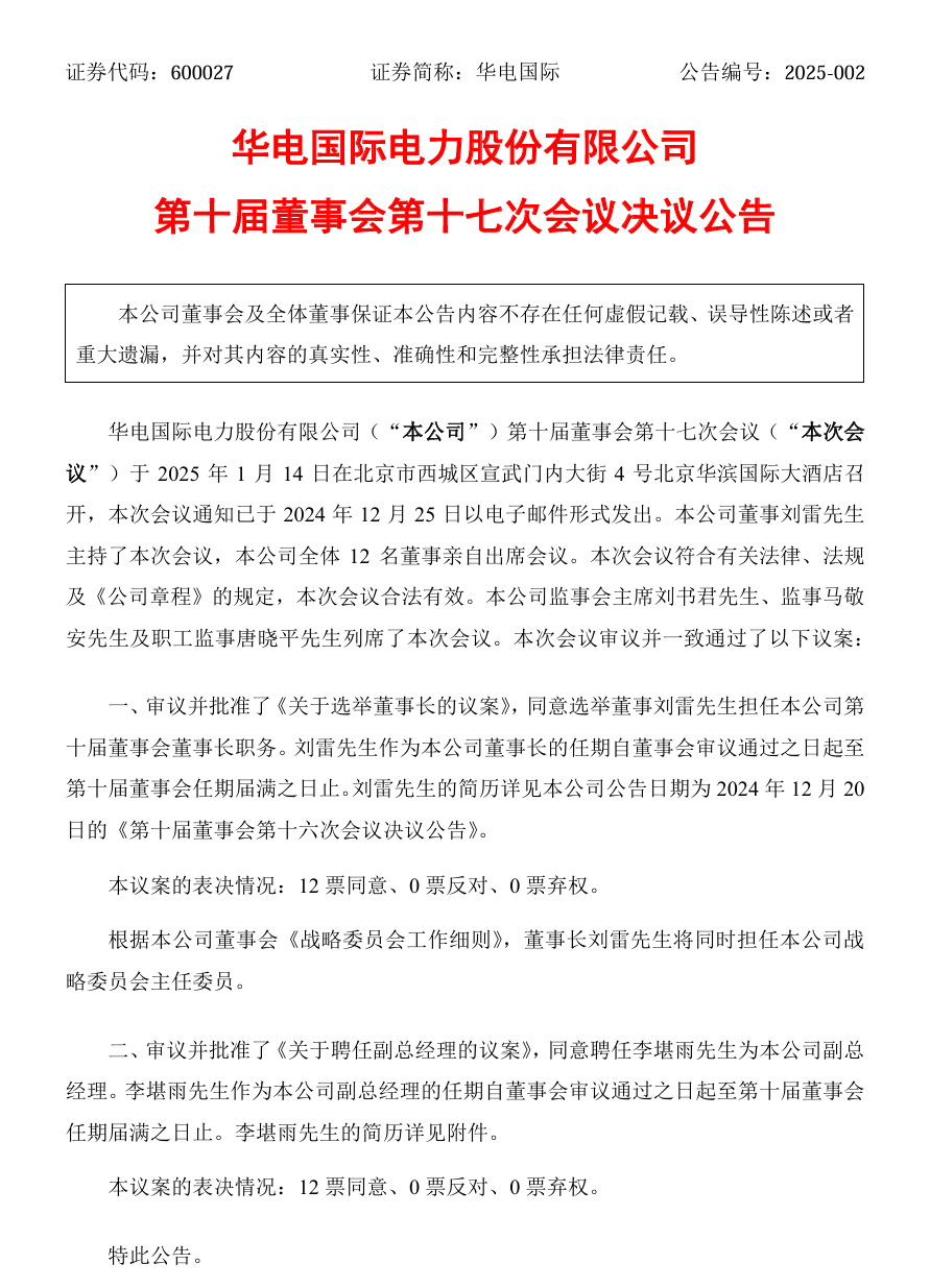 華電國際發(fā)布公告稱,公司第十屆董事會(huì)第十七次會(huì)議于1月14日召開。會(huì)議審議并批準(zhǔn)了《關(guān)于選舉董事長的議案》,同意選舉董事劉雷先生擔(dān)任本公司第十屆董事會(huì)董事長職務(wù)。劉雷先生作為本公司董事長的任期自董事會(huì)審議通過之日起至第十屆董事會(huì)任期屆滿之日止。