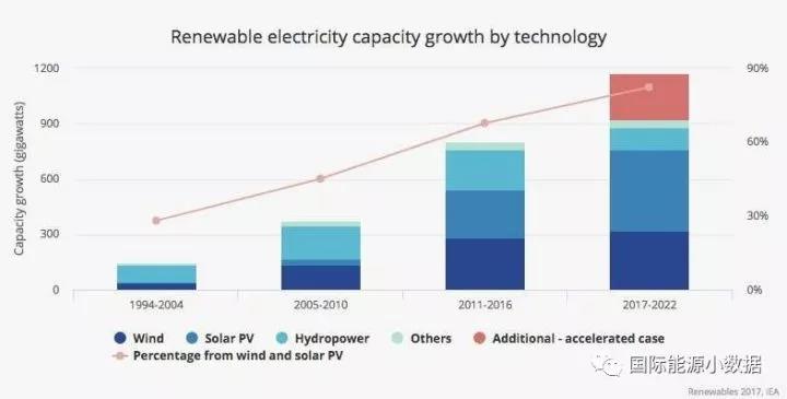 過去對于可再生能源發(fā)展規(guī)模預(yù)測曾經(jīng)偏保守的IEA現(xiàn)在預(yù)測,2017-2022年間全球可再生能源新增裝機將至少達到920吉瓦(其中風(fēng)電321吉瓦、光伏438吉瓦),其中363吉瓦(39%)將來自中國。如果各國政策支持力度加大的樂觀情形下,2017-2022年間可再生能源新增裝機可能達到1150吉瓦,其中464吉瓦(40%)來自中國。
