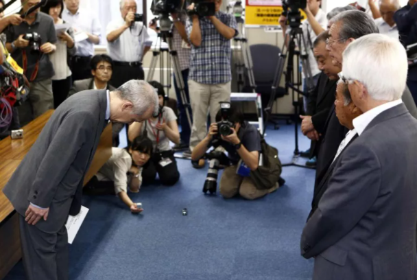 2013年8月29日,在日本東京,日本東京電力公司社長(zhǎng)廣瀨直己(左)向全國(guó)漁業(yè)協(xié)會(huì)聯(lián)合會(huì)的代表鞠躬道歉。日本福島第一核電站先前曝出儲(chǔ)水罐放射性污水大量泄漏事件,引發(fā)日本漁業(yè)團(tuán)體擔(dān)憂和抗議。新華社/法新