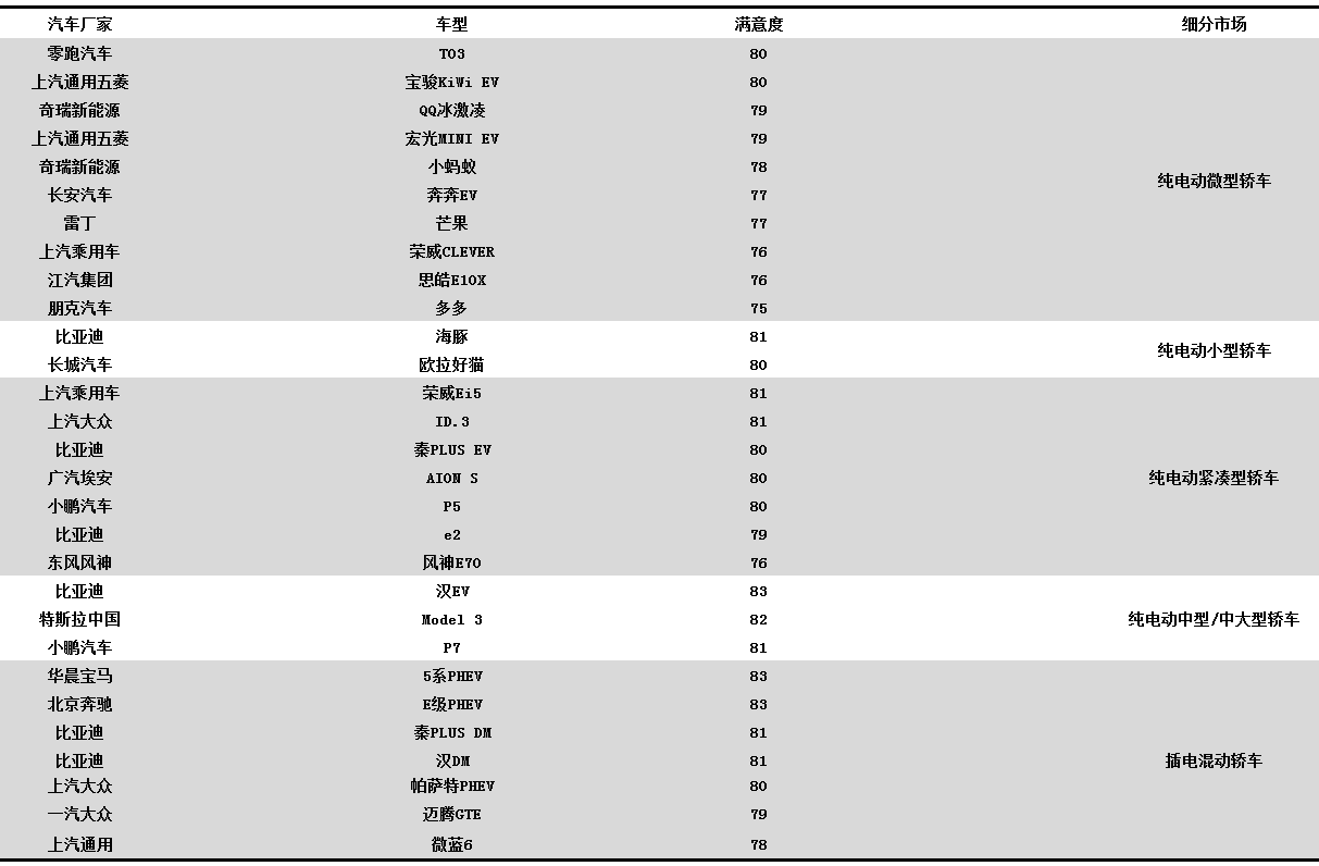 各細分市場新能源汽車綜合滿意度指數(shù)第一的車型分別是: