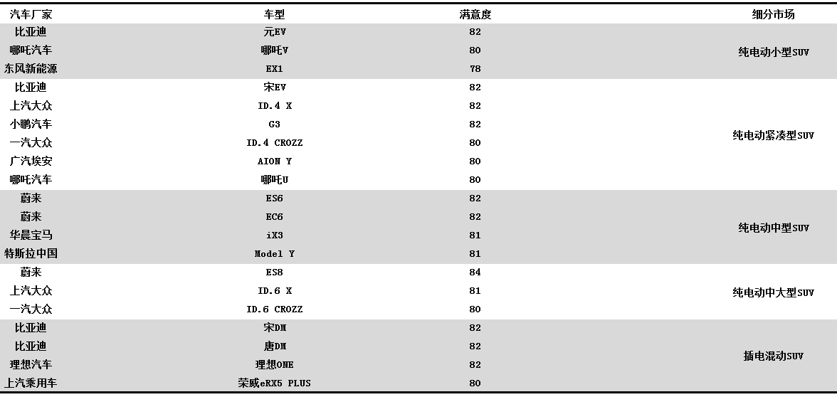 表2 各品牌SUV車型用戶滿意度(NEV-CACSI)