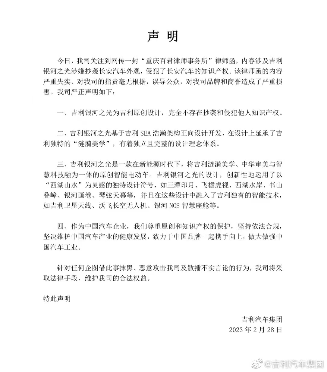 這封律師函曝光幾個小時之后,吉利汽車集團就在官方微博發(fā)表了一份聲明。