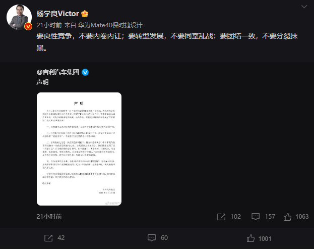 浙江吉利控股集團高級副總裁楊學良隨后轉(zhuǎn)發(fā)了該聲明,并表達了個人觀點,表示:要良性競爭,不要內(nèi)卷內(nèi)訌;要轉(zhuǎn)型發(fā)展,不要同室亂戰(zhàn);要團結(jié)一致,不要分裂抹黑。