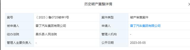 日前,公開信息顯示,雷丁汽車集團有限公司新增一則破產審查案件,案號為(2023)魯0725破申1號,申請人和被申請人均為雷丁汽車集團有限公司,經辦法院為山東省濰坊市昌樂縣人民法院。