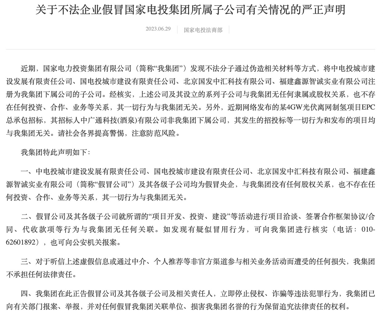 對此,國家電力投資集團有限公司向澎湃新聞表示,經(jīng)核實,中廣通科技(酒泉)有限公司及其母公司中廣通科技(云南)有限公司、中廣通新能源集團有限公司、國元偉達(杭州)科技有限公司、國電投城市建設(shè)有限責任公司均與國家電投集團無任何隸屬或股權(quán)關(guān)系,都是假冒國企,其一切行為與國家電投集團無關(guān)。