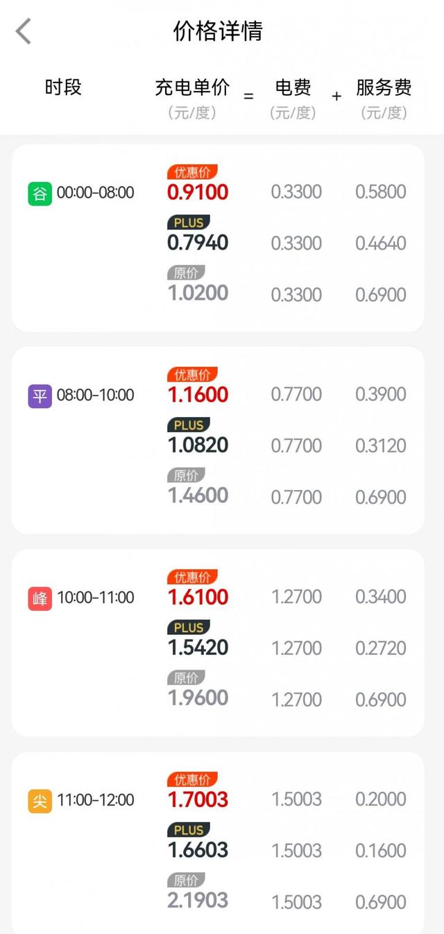 縱向?qū)Ρ瓤?,?月3日越秀公園充電站為例,谷時(shí)是凌晨到次日8:00,充電價(jià)格為1.02元/度;平時(shí)是8:00-10:00、12:00-14:00、19:00-24:00,充電價(jià)格為1.46元/度;峰時(shí)是10:00-11:00、14:00-15:00、17:00-19:00,充電價(jià)格為1.96元/度;此外,尖峰時(shí)段為11:00-12:00、15:00-17:00,充電價(jià)格為2.19元/度。通過計(jì)算可以發(fā)現(xiàn),尖峰電價(jià)大約是谷時(shí)電價(jià)的2.15倍。