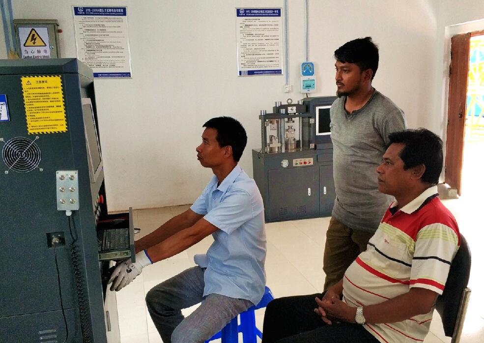 項(xiàng)目試驗(yàn)室建設(shè)引進(jìn)了國內(nèi)項(xiàng)目比較常用的萬能試驗(yàn)機(jī)、壓力試驗(yàn)機(jī)、水泥抗壓抗折一體機(jī)、電動擊實(shí)儀、EV2試驗(yàn)儀、洛氏硬度計(jì)、扭矩試驗(yàn)儀、螺栓抗滑試驗(yàn)儀等40臺套主要試驗(yàn)儀器,多數(shù)是由電腦控制,屬于先進(jìn)設(shè)備。此后,項(xiàng)目試驗(yàn)室主任陳立根成了大家的“中國師傅”,帶領(lǐng)16名孟籍試驗(yàn)員一起學(xué)習(xí)研究業(yè)主招標(biāo)文件和技術(shù)規(guī)格書,手把手教授使用各種試驗(yàn)儀器設(shè)備,帶領(lǐng)大家一起開展路基填料、混凝土配比試拌、鋼筋試驗(yàn)等。“他毫無保留地把自己掌握的試驗(yàn)操作規(guī)程都教給了我們。”然森很慶幸自己擁有這樣一位“中國師傅”。