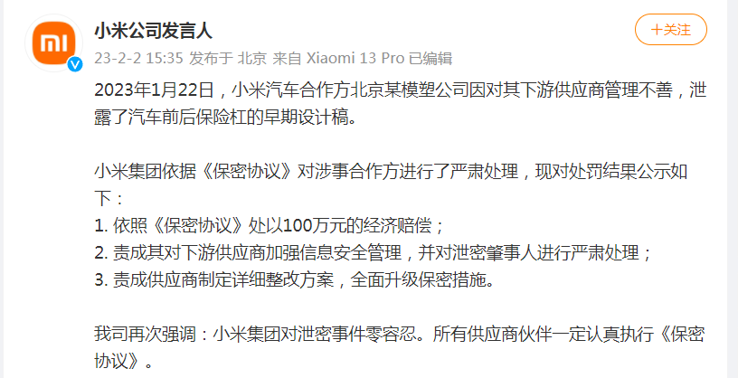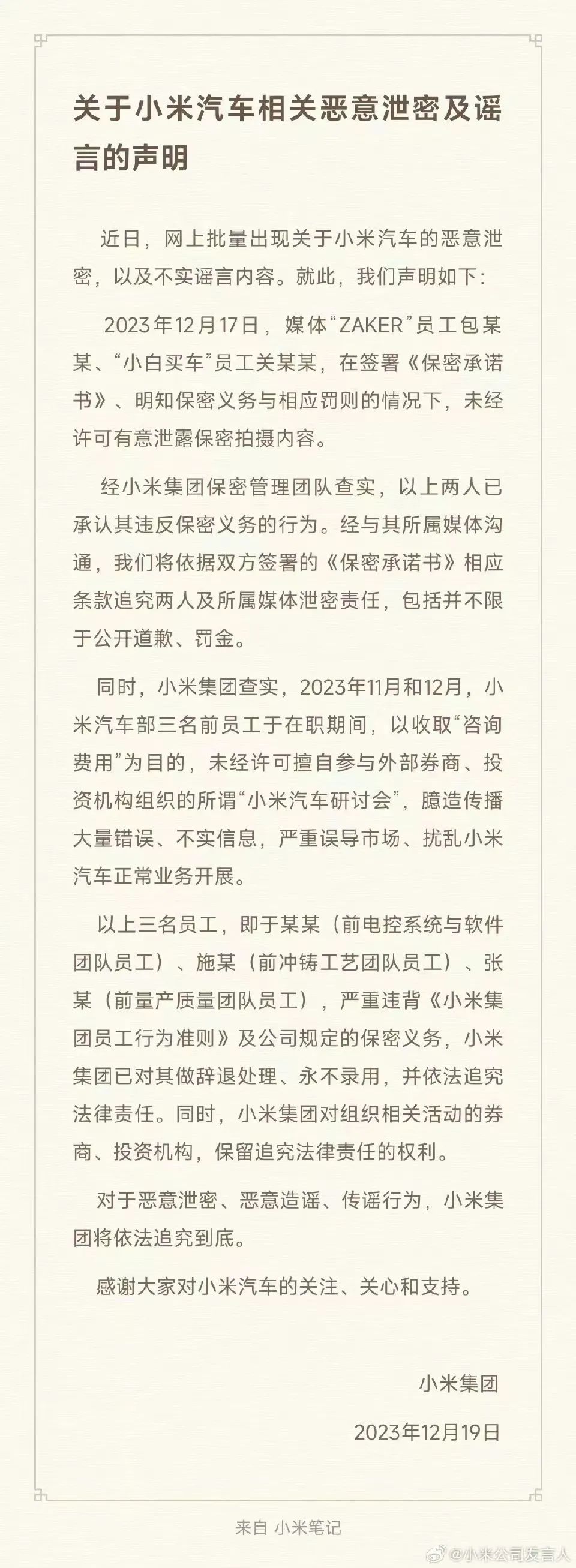 《聲明》稱,2023年12月17日,媒體“ZAKER”員工包某某、“小白買車”員工關(guān)某某,在簽署《保密承諾書》、明知保密義務(wù)與相應(yīng)罰則的情況下,未經(jīng)許可有意泄露保密拍攝內(nèi)容。經(jīng)小米集團(tuán)保密管理團(tuán)隊(duì)查實(shí),以上兩人已承認(rèn)其違反保密義務(wù)的行為。經(jīng)與其所屬媒體溝通,小米集團(tuán)將依據(jù)雙方簽署的《保密承諾書》相應(yīng)條款追究?jī)扇思八鶎倜襟w泄密責(zé)任,包括并不限于公開道歉、罰金。另外,《聲明》介紹,2023年11月和12月,小米汽車部三名前員工于在職期間,以收取“咨詢費(fèi)用”為目的,未經(jīng)許可擅自參與外部券商、投資機(jī)構(gòu)組織的所謂“小米汽車研討會(huì)”,臆造傳播大量錯(cuò)誤、不實(shí)信息,嚴(yán)重誤導(dǎo)市場(chǎng)、擾亂小米汽車正常業(yè)務(wù)開展。以上三名員工,即于某某(前電控系統(tǒng)與軟件團(tuán)隊(duì)員工)、施某(前沖鑄工藝團(tuán)隊(duì)員工)、張某(前量產(chǎn)質(zhì)量團(tuán)隊(duì)員工),嚴(yán)重違背《小米集團(tuán)員工行為準(zhǔn)則》及公司規(guī)定的保密義務(wù),小米集團(tuán)已對(duì)其做辭退處理、永不錄用,并依法追究法律責(zé)任。同時(shí),小米集團(tuán)表示,對(duì)組織相關(guān)活動(dòng)的券商、投資機(jī)會(huì),保留追究法律責(zé)任的權(quán)利。小米汽車始終吸引市場(chǎng)高度關(guān)注,這也不是小米集團(tuán)第一次遭遇汽車泄密。今年1月22日,小米汽車合作方北京某模塑科技有限公司因?qū)ζ湎掠喂?yīng)商管理不善,泄露了小米汽車前后保險(xiǎn)杠的早期設(shè)計(jì)稿。“小米公司發(fā)言人”微博今年2月更新了該泄密事件的處理結(jié)果:小米集團(tuán)表示,已依據(jù)《保密協(xié)議》對(duì)涉事合作方進(jìn)行了嚴(yán)肅處理,包括依照《保密協(xié)議》處以100萬(wàn)元的經(jīng)濟(jì)賠償;責(zé)成其對(duì)下游供應(yīng)商加強(qiáng)信息安全管理,并對(duì)泄密肇事人進(jìn)行嚴(yán)肅處理;責(zé)成供應(yīng)商制定詳細(xì)整改方案,全面升級(jí)保密措施。