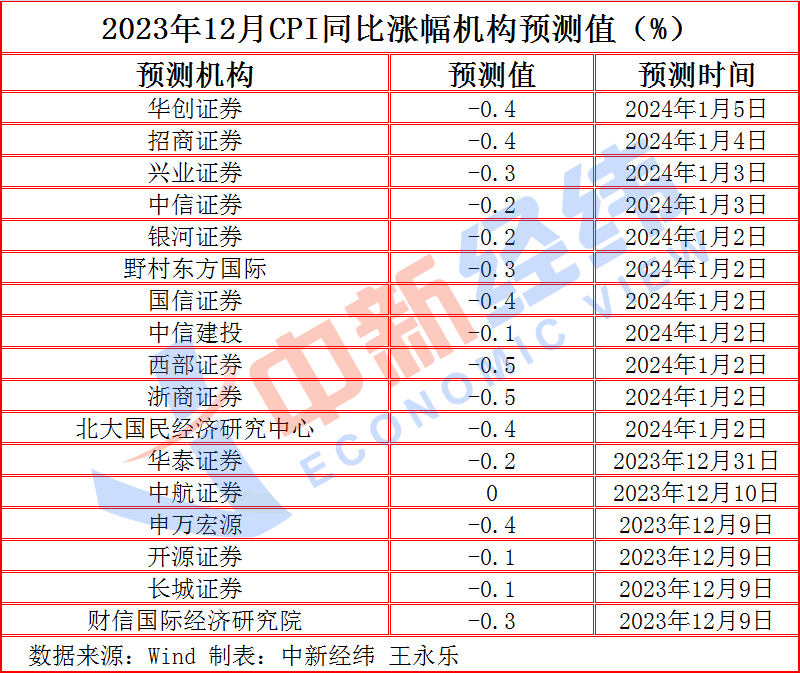 對(duì)于即將揭曉的2023年12月CPI數(shù)據(jù),Wind數(shù)據(jù)顯示,截至1月11日,17家機(jī)構(gòu)對(duì)12月CPI同比漲幅的預(yù)測(cè)均值為-0.3%。從預(yù)測(cè)值來看,1家為0%,9家在-0.3%~-0.1%區(qū)間,5家為-0.4%,2家為-0.5%,預(yù)測(cè)值最高為中航證券給出的0%,最低為西部證券、浙商證券給出的-0.5%。若按照機(jī)構(gòu)預(yù)測(cè)的均值計(jì)算,CPI同比降幅將收窄,且連續(xù)三個(gè)月處于負(fù)值區(qū)間。