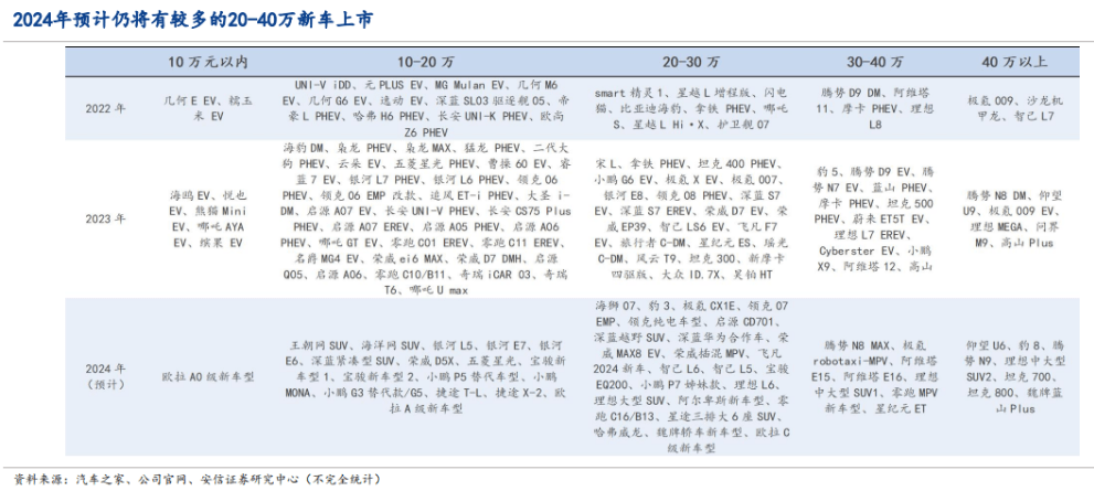 安信證券研究中心發(fā)布的研究報告認為,新能源車高端化仍有較大的空間。在40萬元以上的市場中,新能源汽車滲透率相對較低,相關(guān)數(shù)據(jù)顯示,2023年1-10月僅為17.5%,與40萬以下市場相比,新能源滲透率仍有較大的提升空間。安信證券研究中心預測,2024年高端新能源車銷量及占比有望持續(xù)提升,在多款全新高端車型上市的催化下,2024年20萬-30萬元、30萬-40萬、40萬元以上新能源車銷售占比將達28.4%、11.4%及6%,新能源車行業(yè)結(jié)構(gòu)有望進一步高端化。