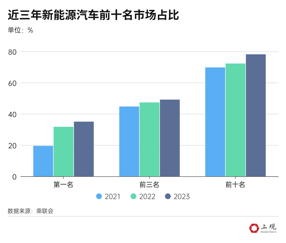 目前來看,誰(shuí)贏還真說不定,但尾部企業(yè)肯定日子更難。政府補(bǔ)貼退坡后,新能源汽車銷量本來就越來越集中在頭部企業(yè)。最近三年,前十名的市場(chǎng)占比增加了約10%,接近80%。銷量第一名的比亞迪,所占的市場(chǎng)份額達(dá)到35%。而在2021年,這一占比僅為19.5%。