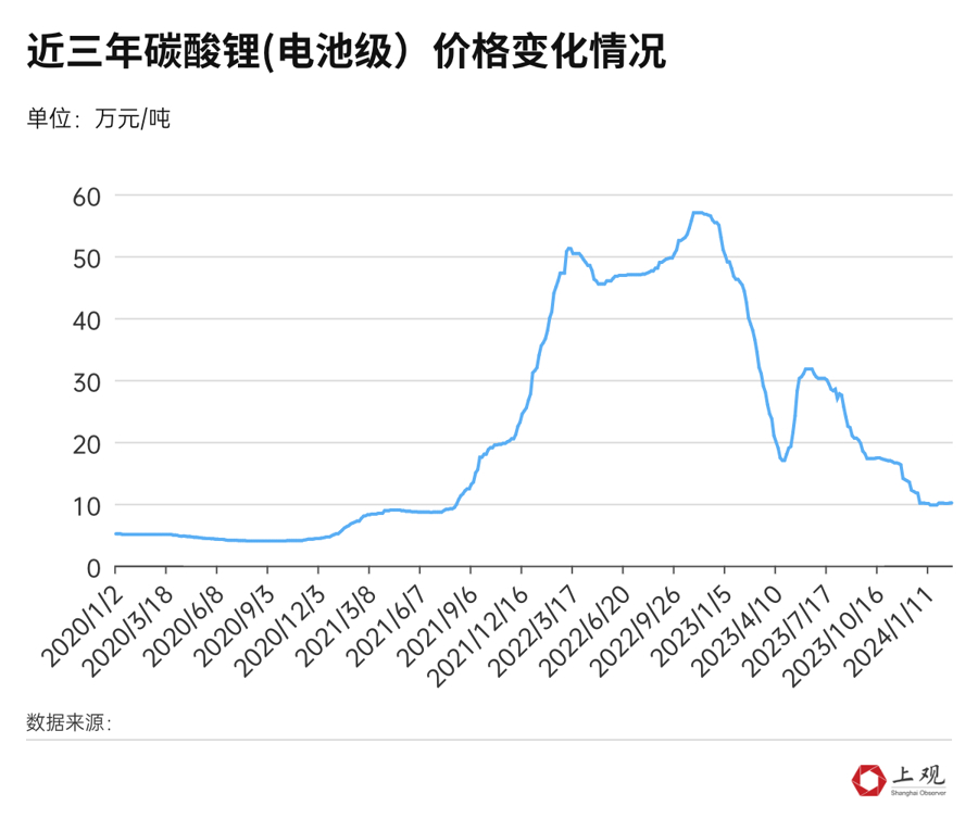 國(guó)產(chǎn)電池級(jí)碳酸鋰的價(jià)格,在2022年底到達(dá)峰值后,便開始滑坡式下降,相比峰值接近60萬元/噸的價(jià)格,目前已降至10.15萬元/噸,降幅達(dá)到82.2%。