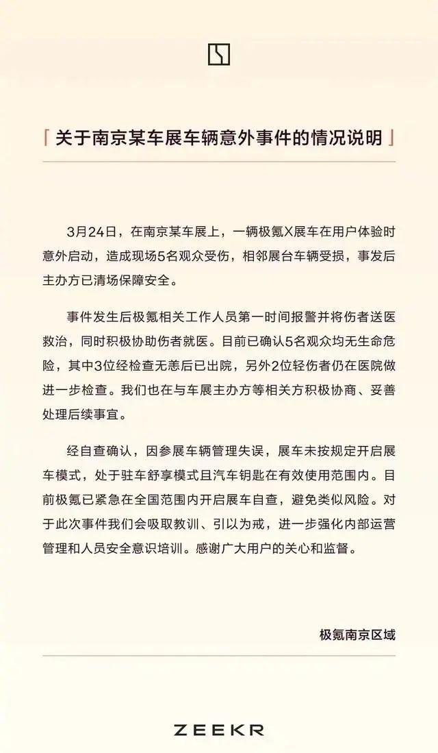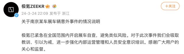 針對此次意外事件,極氪官方微博@極氪ZEEKR 于3月24日22時09分發(fā)布《關于南京某車展車輛意外事件的情況說明》。