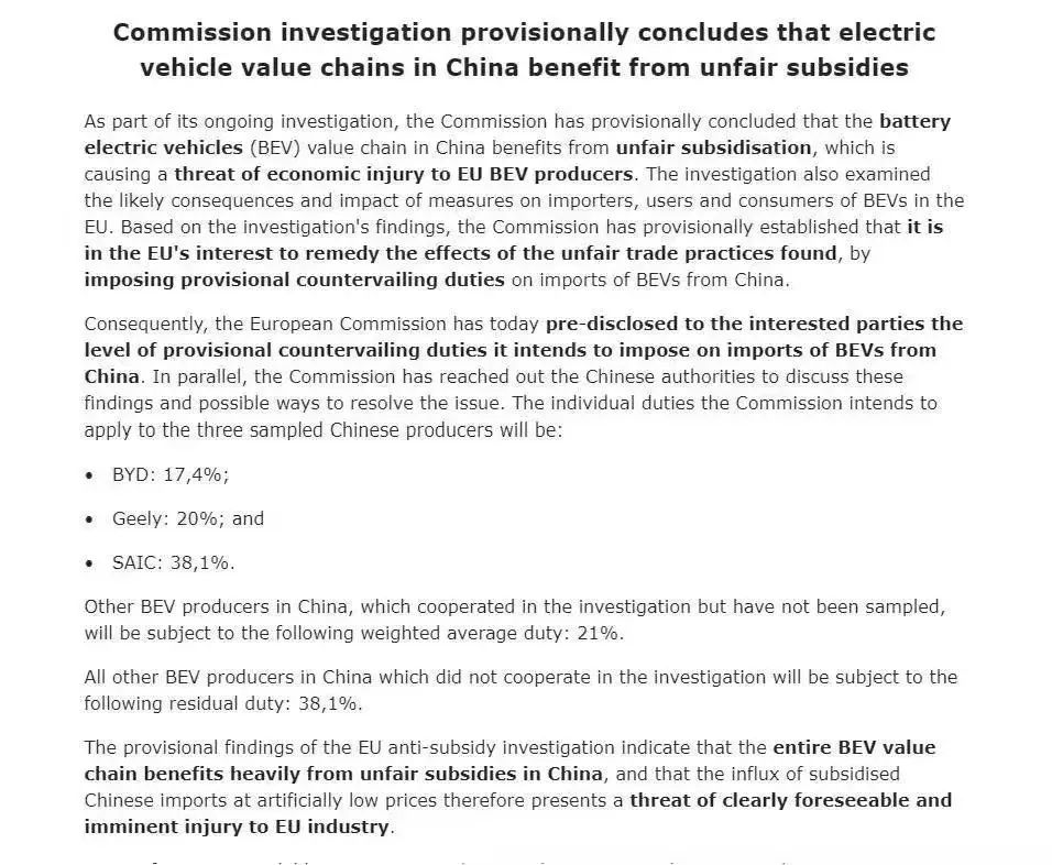 歐盟委員會公告發(fā)布后,商務(wù)部新聞發(fā)言人也表態(tài)稱,歐委會罔顧中國電動汽車優(yōu)勢來自開放競爭的客觀事實(shí),罔顧世貿(mào)組織規(guī)則,罔顧中國相關(guān)企業(yè)對有關(guān)調(diào)查的全面配合,人為構(gòu)造并夸大所謂的“補(bǔ)貼”項(xiàng)目,濫用“可獲得事實(shí)”規(guī)則,裁出畸高的補(bǔ)貼幅度,是赤裸裸的保護(hù)主義行為,是制造并升級貿(mào)易摩擦,是以“維護(hù)公平競爭”為名行“破壞公平競爭”之實(shí),是最大的“不公平”。中方將密切關(guān)注歐方后續(xù)進(jìn)展,并將堅(jiān)決采取一切必要措施,堅(jiān)定捍衛(wèi)中國企業(yè)的合法權(quán)益。