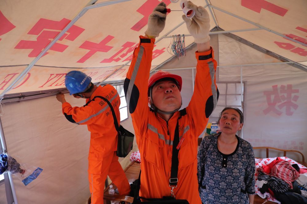 2019年6月19日,高新連心橋黨員服務(wù)隊(duì)馳援宜賓抗震救災(zāi),為受災(zāi)群眾安置點(diǎn)帳篷接電。新華社發(fā)(謝勇 攝)