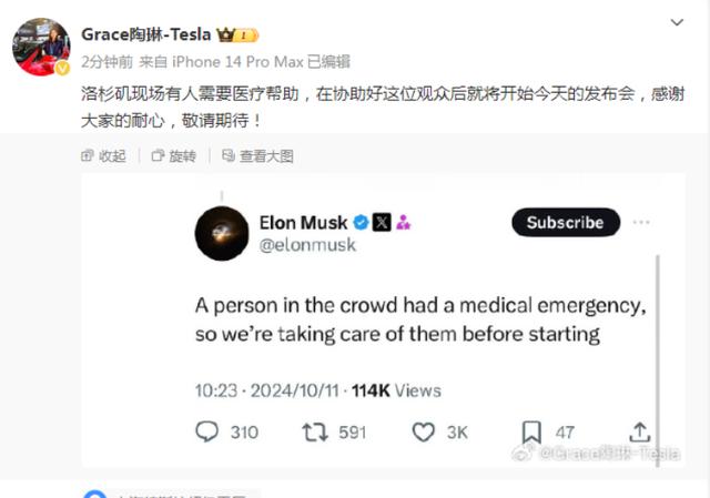 北京時(shí)間10月11日消息,原定于北京時(shí)間10點(diǎn)舉行的特斯拉Robotaxi發(fā)布會(huì)已經(jīng)推遲了半個(gè)小時(shí),至今還未開始。正當(dāng)大家紛紛猜測(cè)緣由時(shí),馬斯克在社交媒體上公布了原因,稱現(xiàn)場(chǎng)有人突發(fā)疾病暈倒需要照顧,因此發(fā)布會(huì)推遲舉行,但他未確定具體開始的時(shí)間。