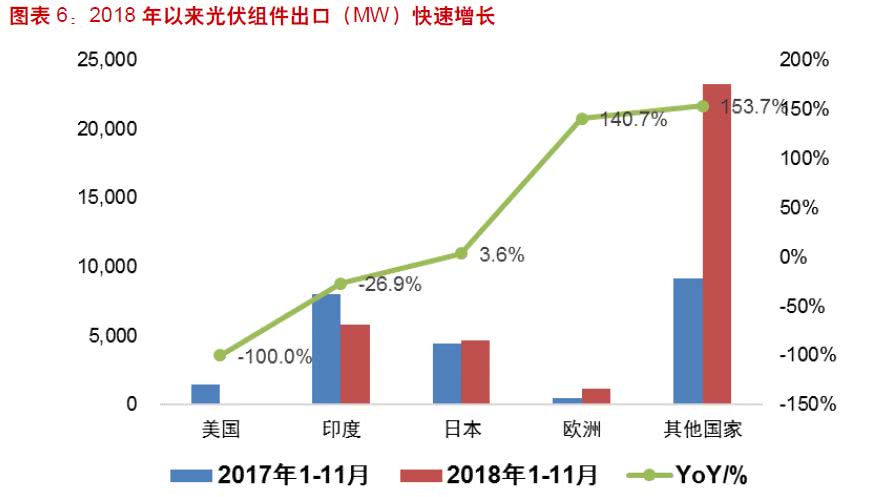 中國光伏行業(yè)協(xié)會的數(shù)據(jù)顯示,2018年光伏產(chǎn)品(硅片、電池片、組件)出口總額達(dá)161.1億美元,創(chuàng)下歐美“雙反”后最高水平,同比增長10.9%。組件市場方面,光伏市場出口集中度繼續(xù)下降,形成傳統(tǒng)市場和新興市場(南美、中東北非)結(jié)合的多元化市場傳統(tǒng)市場方面,因歐盟取消了長達(dá)五年的“雙反”政策,歐洲市場復(fù)蘇,對荷蘭、德國、英國等歐洲主要國家的組件出口同比增長,對烏克蘭、西班牙的組件出口大幅增長。中國光伏行業(yè)協(xié)會預(yù)測,歐盟市場2019年增速明顯增高,可達(dá)11GW,西班牙等啟動平價上網(wǎng)項(xiàng)目,法國、荷蘭、意大利等也將有較大幅度增長。