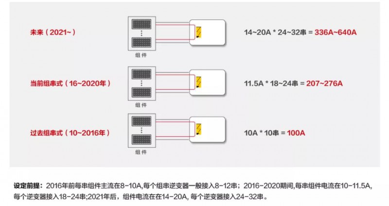 隨著硅片尺寸越來越大以及電池效率越來越高,組件電流不斷提高成為必然趨勢。我們看到,組件電流越來越大,逆變器功率或匯流箱對應的組串數(shù)量也不斷增加。