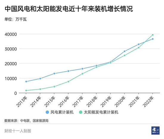 在可再生能源領(lǐng)域,風(fēng)電裝機量一直都領(lǐng)先于太陽能發(fā)電;2022年,兩者位置互換,中國太陽能發(fā)電裝機量首次超過了風(fēng)電。