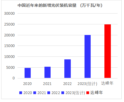 中國(guó)光伏發(fā)電新增容量近年來(lái)的變化可請(qǐng)參見(jiàn)下圖。