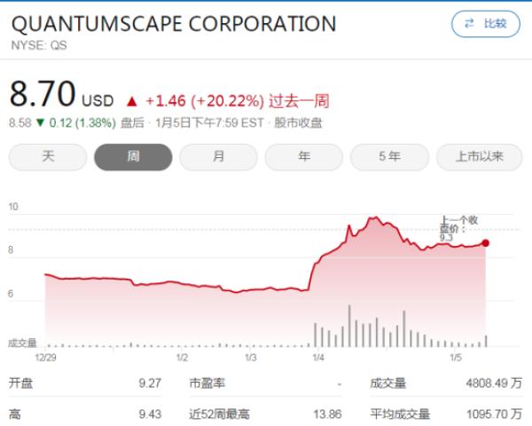 此次其固態(tài)電池通過(guò)大眾集團(tuán)方面耐久性測(cè)試的消息公布后第二日,QuantumScape股上漲 43%,收于 9.30 美元,創(chuàng)下 8 月以來(lái)的最高收盤(pán)價(jià)。盤(pán)中上漲約54%。該股在過(guò)去52周內(nèi)上漲了 72%,但較 2020 年 12 月創(chuàng)下的歷史高點(diǎn)下跌 93%。