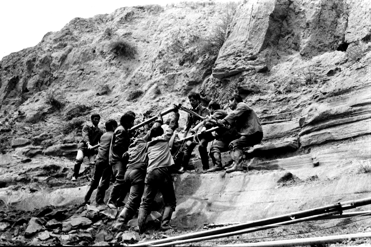 為了確保山頂油水井的正常生產(chǎn),小伙子們每天負(fù)重20多斤的作業(yè)工具,借著管橋越過無人溝,沿著羊徑小道登山巡井。在這道以大風(fēng)作幕帳、以黃土為面紗的陡峭山坡上,年輕的石油人頂風(fēng)冒雪搞鉆探,人拉肩扛戰(zhàn)荒原,發(fā)出“好漢坡上好漢多,風(fēng)似鋼刀雨如梭。讓那青春來拼搏,莫將歲月空蹉跎”的豪邁誓言,以“不到長城非好漢”的氣魄,硬是踏出了一條石油報國的艱辛創(chuàng)業(yè)路。
