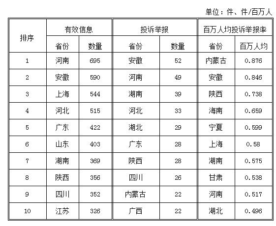 2018年1月,各?。ㄗ灾螀^(qū)、直轄市)按照有效信息數(shù)量排序,河南、安徽、上海等省(市)列全國前10位;按照投訴舉報數(shù)量排序,安徽、河南、湖南等省排在全國前10位;按照百萬人均投訴舉報率排序,內(nèi)蒙古、安徽、陜西等?。ㄗ灾螀^(qū))位于全國前10位。(2018年1月有效信息及投訴舉報排名前10位情況見表三)