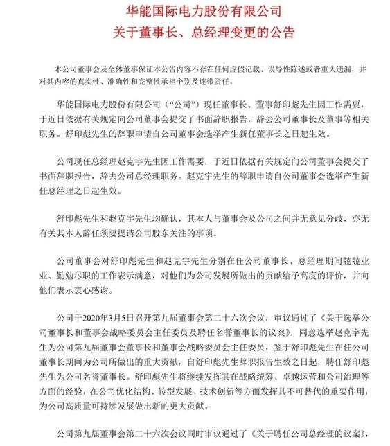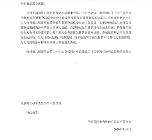 中國(guó)電力網(wǎng)訊 3月5日,華能國(guó)際電力股份有限公司發(fā)布公告,因工作需要,現(xiàn)任董事長(zhǎng)、董事舒印彪和現(xiàn)任總經(jīng)理趙克宇于近日提交書面辭職報(bào)告,辭去相關(guān)職務(wù)。當(dāng)日,公司董事會(huì)同意選舉趙克宇為公司第九屆董事會(huì)董事長(zhǎng)和董事會(huì)戰(zhàn)略委員會(huì)主任委員。