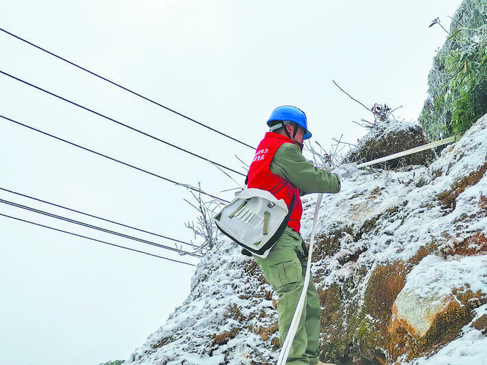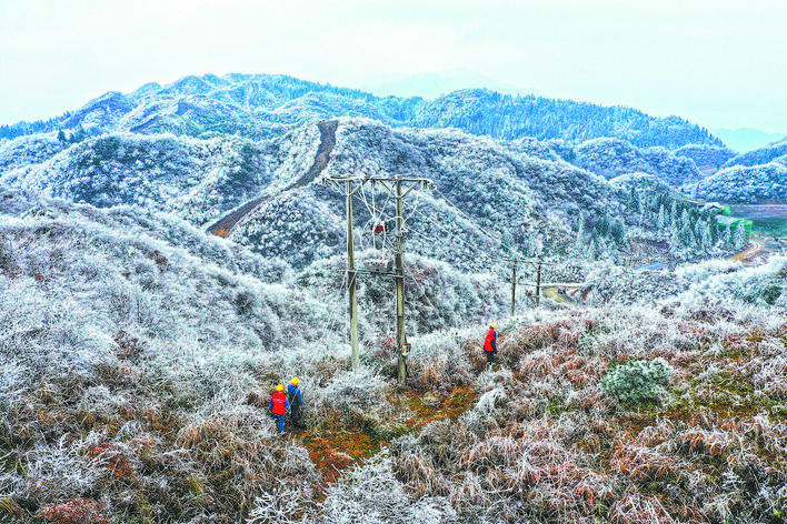 圖① 1月6日,國家電網(wǎng)湖南電力共產(chǎn)黨員服務隊在雪峰山觀冰站巡檢線路。 胡浩 攝