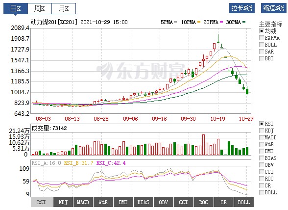 10月28日,受政策監(jiān)管沖擊,煤炭股市、期貨市場延續(xù)跌勢,煤炭概念跳水跌超6%,兗州煤業(yè)( 600188.SH )等多股跌停。商品期貨方面,動力煤跌2.25%,而在此之前的幾個交易日,以鄭商所動力煤為例,其價(jià)格直接攔腰斬?cái)?,?0月19日每噸1982元高點(diǎn)直落至10月28日夜間收市的1041元。