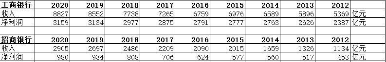 工商銀行、招商銀行2012-2020年營收、利潤(單位:億元,人民幣)