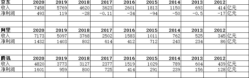 京東、阿里、騰訊2012-2020年營收、利潤(單位:億元,人民幣)