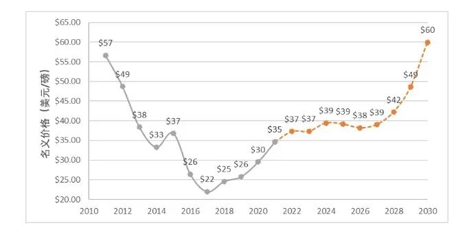 報(bào)告還對(duì)2022-2030年天然鈾現(xiàn)貨價(jià)格作了預(yù)測(cè)。之所以選擇對(duì)長(zhǎng)期現(xiàn)貨價(jià)格進(jìn)行預(yù)測(cè),是因?yàn)樵搩r(jià)格是反應(yīng)市場(chǎng)供需關(guān)系的主要指標(biāo),是長(zhǎng)貿(mào)協(xié)議引用的重要指數(shù),且不易受到短期市場(chǎng)投機(jī)行為的影響。