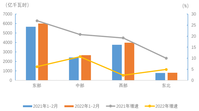 1-2月,東、中、西部和東北地區(qū)②全社會用電量分別為6006、2666、3986和809億千瓦時,增速分別為6.2%、10.7%、2.3%和5.0%。