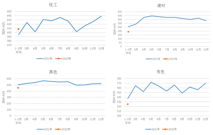 1-2月,化工行業(yè)用電量861億千瓦時,同比增長4.9%,增速比上年同期回落9.4個百分點;建材行業(yè)用電量478億千瓦時,同比下降7.0%,增速比上年同期回落46.4個百分點;黑色金屬冶煉行業(yè)用電量966億千瓦時,同比下降5.0%,增速比上年同期回落23.8個百分點;有色金屬冶煉行業(yè)用電量1111億千瓦時,同比下降0.1%,增速比上年同期回落12.8個百分點。