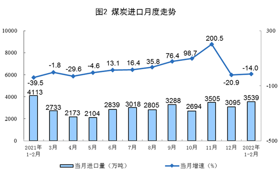 原煤生產(chǎn)較快增長(zhǎng),進(jìn)口降幅收窄。1—2月份,生產(chǎn)原煤6.9億噸,同比增長(zhǎng)10.3%,增速比上年12月份加快3.1個(gè)百分點(diǎn),日均產(chǎn)量1164萬(wàn)噸。進(jìn)口煤炭3539萬(wàn)噸,同比下降14.0%,降幅比上年12月份收窄6.9個(gè)百分點(diǎn)。