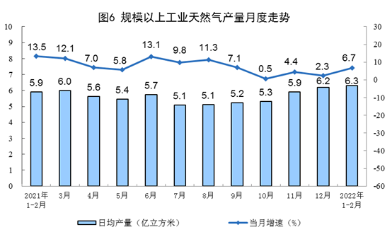 天然氣生產(chǎn)保持增長(zhǎng),進(jìn)口下降。1—2月份,生產(chǎn)天然氣372億立方米,同比增長(zhǎng)6.7%,增速比上年12月份加快4.4個(gè)百分點(diǎn),日均產(chǎn)量6.3億立方米。進(jìn)口天然氣1986萬(wàn)噸,同比下降3.8%,上年12月份為增長(zhǎng)4.6%。