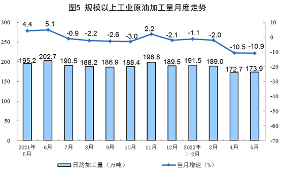 原油加工量繼續(xù)下降。5月份,加工原油5392萬噸,同比下降10.9%,降幅比上月擴大0.4個百分點,日均加工173.9萬噸。1—5月份,加工原油27716萬噸,同比下降5.3%。
