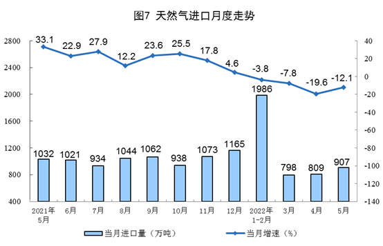 天然氣生產(chǎn)保持穩(wěn)定,進口降幅收窄。5月份,生產(chǎn)天然氣177億立方米,同比增長4.9%,增速比上月加快0.2個百分點,日均產(chǎn)量5.7億立方米。進口天然氣907萬噸,同比下降12.1%,降幅比上月收窄7.5個百分點。