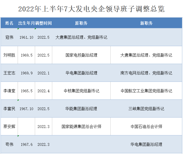 2022年上半年7大發(fā)電央企領(lǐng)導(dǎo)層人事變動(dòng)