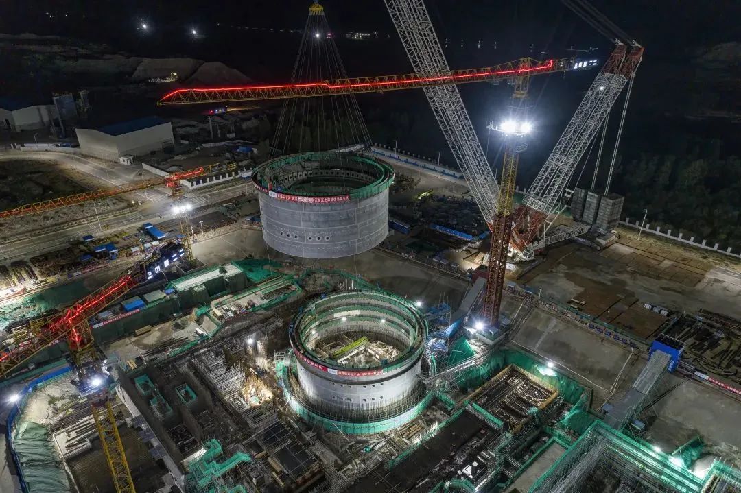 本次吊裝的鋼制安全殼上部筒體整體高度約15米,吊裝重量約720噸,是玲龍一號工程單次重量最大的一次吊裝。鋼制安全殼上部筒體整體由4層共32個瓣片拼裝而成,現(xiàn)場采用了工廠化制造、模塊化施工的先進建設模式,優(yōu)化了現(xiàn)場施工邏輯,有效節(jié)約了現(xiàn)場施工工期,為反應堆土建結(jié)構(gòu)與鋼結(jié)構(gòu)協(xié)同推進創(chuàng)造了條件。