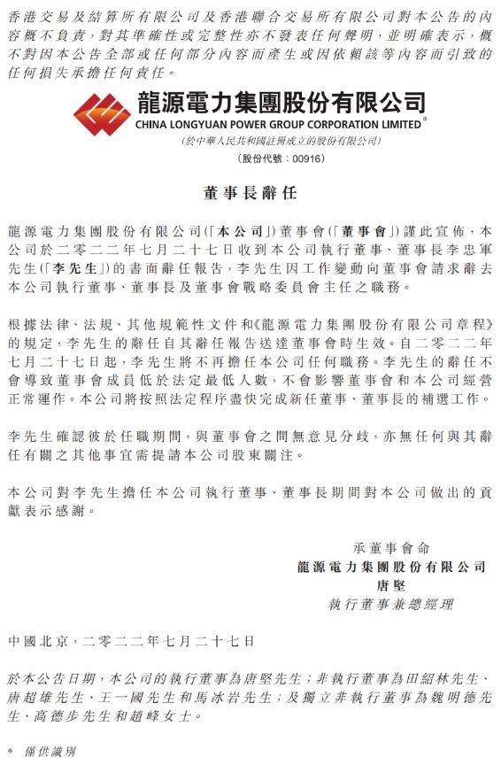本網(wǎng)訊 根據(jù)公告,龍源電力董事會于2022年7月27日收到公司董事長李忠軍的書面辭任報告,李忠軍因工作變動,向董事會申請辭去公司執(zhí)行董事、董事長以及董事會戰(zhàn)略委員會主任之職務(wù)。李忠軍的辭任自其辭任報告送達董事會時生效。自2022年7月27日起,李忠軍將不再擔(dān)任公司任何職務(wù)。
