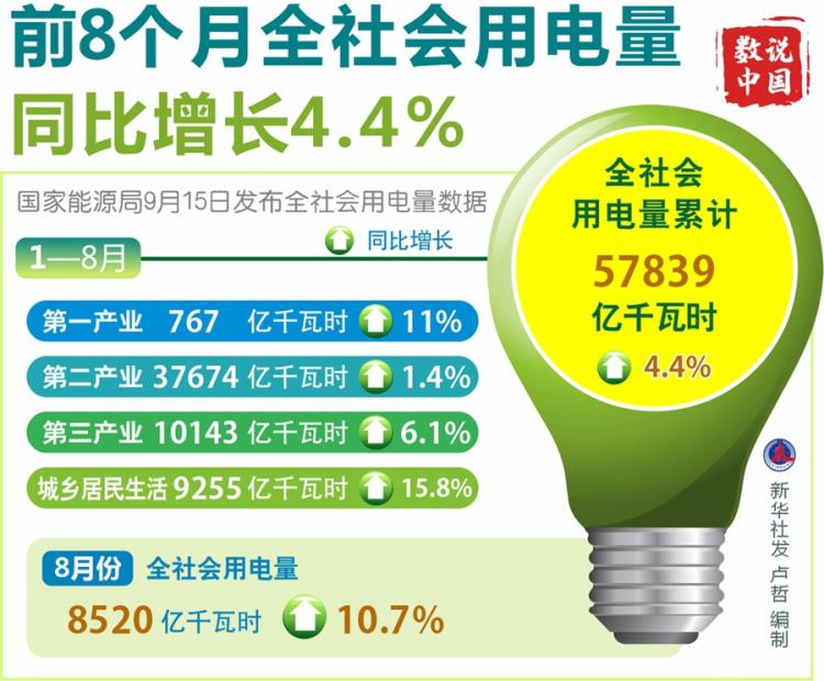本網(wǎng)訊 國家能源局15日發(fā)布今年前8個(gè)月全社會(huì)用電量數(shù)據(jù)。今年前8個(gè)月全社會(huì)用電量累計(jì)57839億千瓦時(shí),同比增長(zhǎng)4.4%。