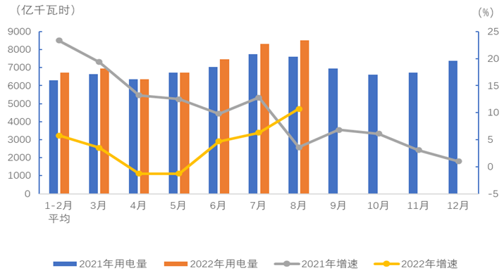 8月份,東、中、西部和東北地區(qū)全社會用電量增速分別為8.6%、22.3%、8.6%和0.2%。