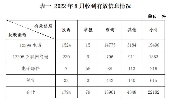 2022年8月,國家能源局12398能源監(jiān)管熱線(以下簡稱12398熱線)共收到有效信息22182件(包含投訴、舉報、咨詢和其他訴求類別),環(huán)比增加18.10%,同比增加77.67%。(2022年8月收到有效信息情況見表一)