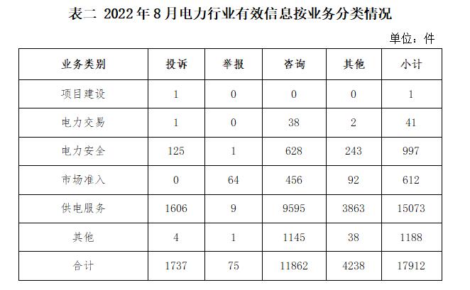 電力行業(yè)排在首位,有效信息數(shù)量為17912件,占全部有效信息的80.75%。群眾關(guān)注的內(nèi)容主要集中在供電服務(wù)、電力安全、市場準入等方面。(2022年8月電力行業(yè)有效信息按業(yè)務(wù)分類情況見表二)